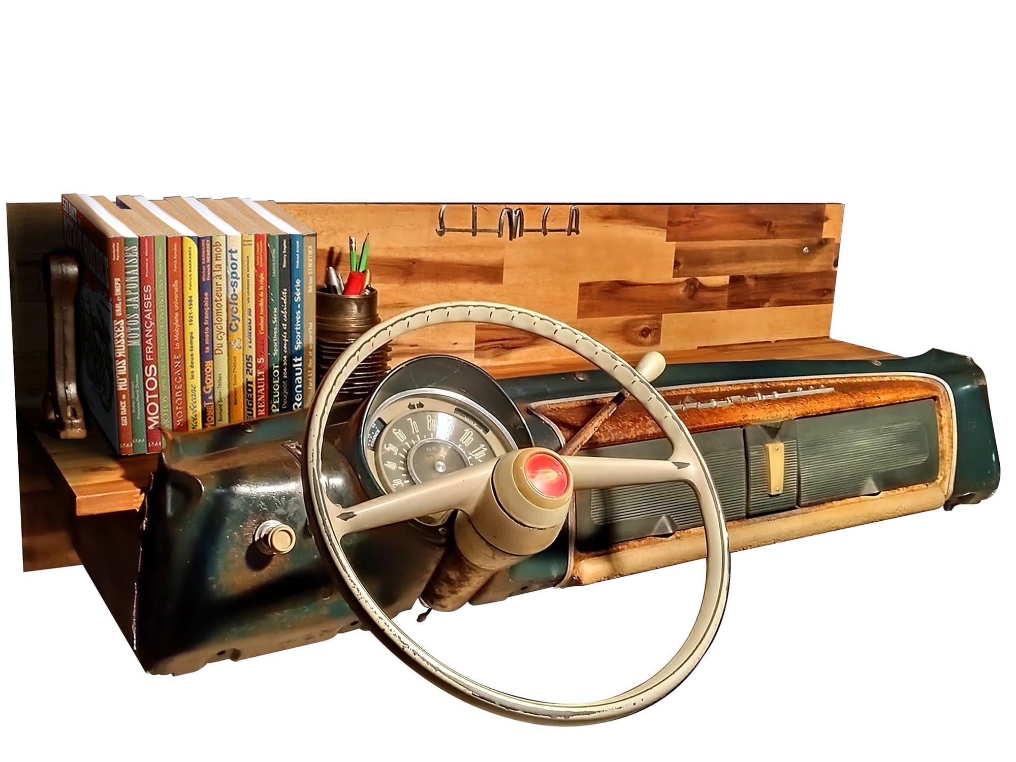 Cadeau voitures anciennes, 2ème vie éco-responsable, tableau de bord détourné en Bibliothèque
