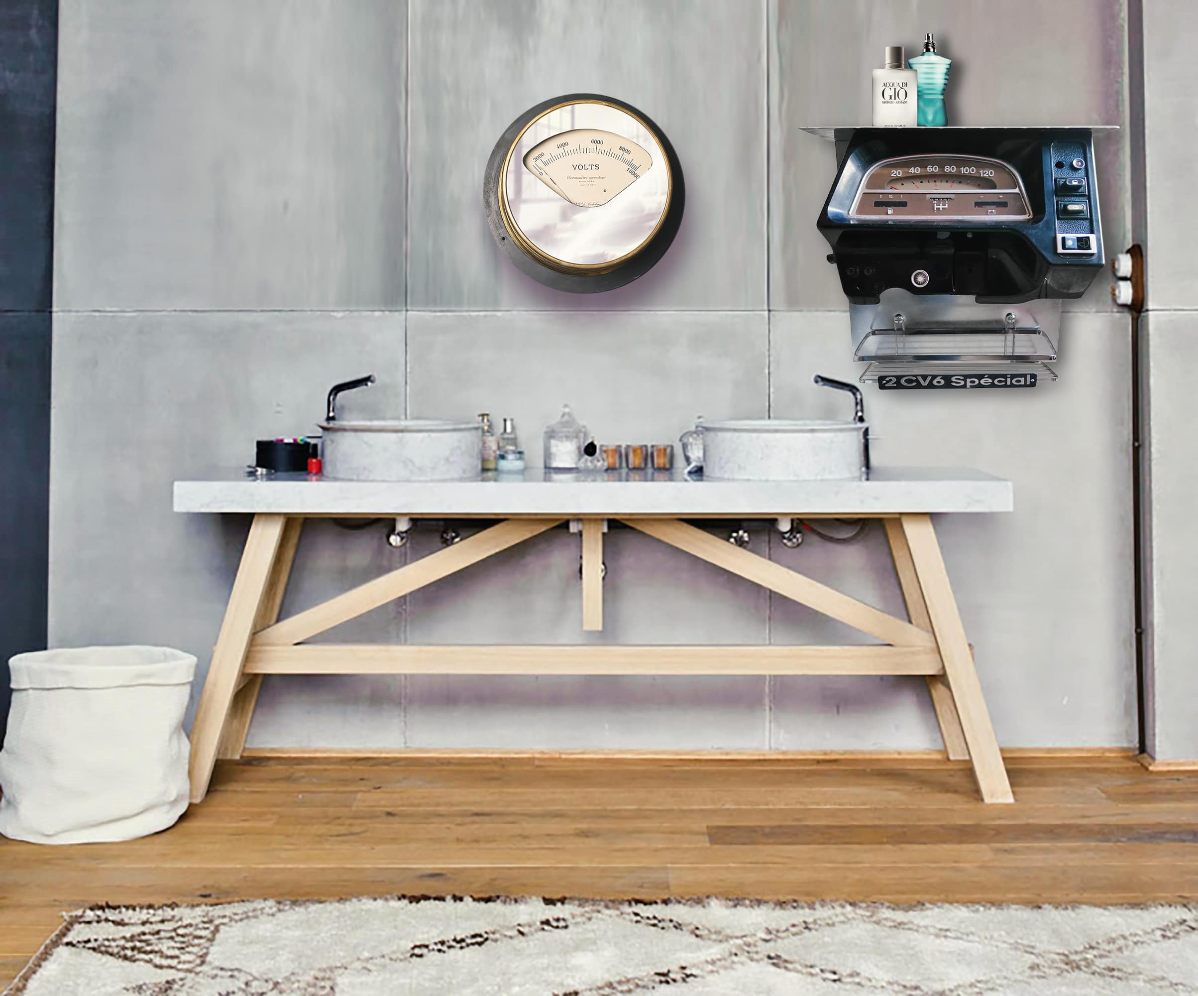 Les hommes de la maison Fans de 2CV peuvent aussi adapter cette oeuvre dans la salle de bain. Deux endroits pour déposer des produits de toilette.